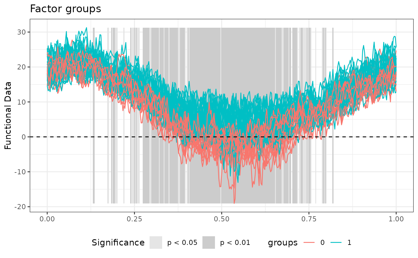 call: The matched call.design_matrix: The design matrix of the functional-on-scalar linear model.unadjusted_pval_F: Evaluation on a grid of the unadjusted p-value function of the functional F-test.adjusted_pval_F: Evaluation on a grid of the adjusted p-value function of the functional F-test.unadjusted_pval_factors: Evaluation on a grid of the unadjusted p-value function of the functional F-tests on each factor of the analysis of variance (rows).adjusted_pval_factors: Adjusted p-values of the functional F-tests on each factor of the analysis of variance (rows) and each basis coefficient (columns).data_eval: Evaluation on a fine uniform grid of the functional data obtained through the basis expansion.coeff_regr_eval: Evaluation on a fine uniform grid of the functional regression coefficients.fitted_eval: Evaluation on a fine uniform grid of the fitted values of the functional regression.residuals_eval: Evaluation on a fine uniform grid of the residuals of the functional regression.R2_eval: Evaluation on a fine uniform grid of the functional R-squared of the regression.