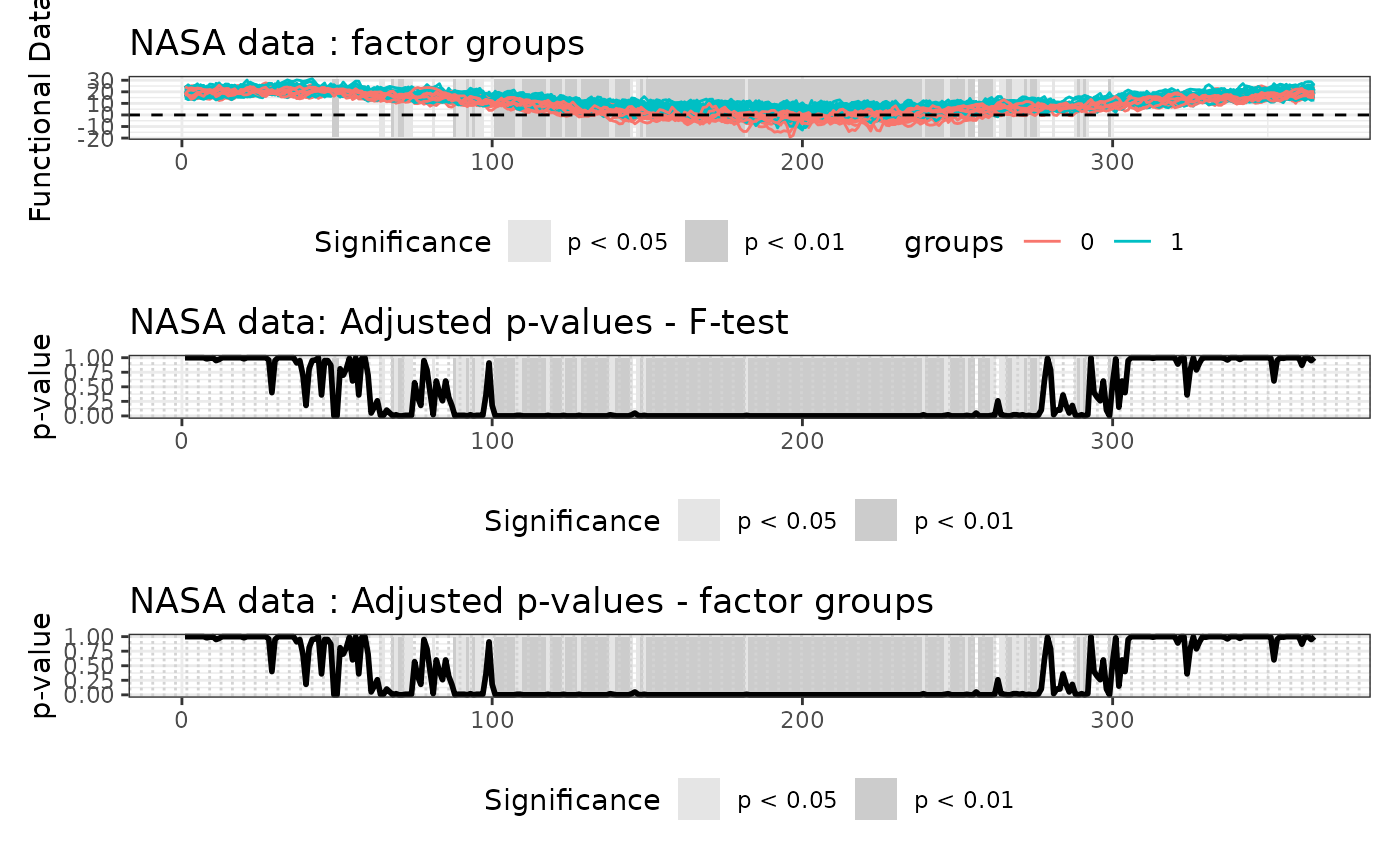 pval_matrix_F: Matrix of dimensionsc(p,p)of the p-values of the intervalwise F-tests. The element \((i,j)\) of matrixpval_matrixcontains the p-value of the test of interval indexed by \((j,j+1,...,j+(p-i))\); this component is present only ifcorrectionis set to"IWT".pval_matrix_factors: Array of dimensionsc(L+1,p,p)of the p-values of the multivariate F-tests on factors. The element \((l,i,j)\) of arraypval_matrixcontains the p-value of the joint NPC test on factorlof the components \((j,j+1,...,j+(p-i))\); this component is present only ifcorrectionis set to"IWT".heatmap_matrix_F: Heatmap matrix of p-values of functional F-test (used only for plots); this component is present only ifcorrectionis set to"IWT".heatmap_matrix_factors: Heatmap matrix of p-values of functional F-tests on each factor of the analysis of variance (used only for plots); this component is present only ifcorrectionis set to"IWT".Global_pval_F: Global p-value of the overall test F; this component is present only ifcorrectionis set to"Global".Global_pval_factors: Global p-value of test F involving each factor separately; this component is present only ifcorrectionis set to"Global".
